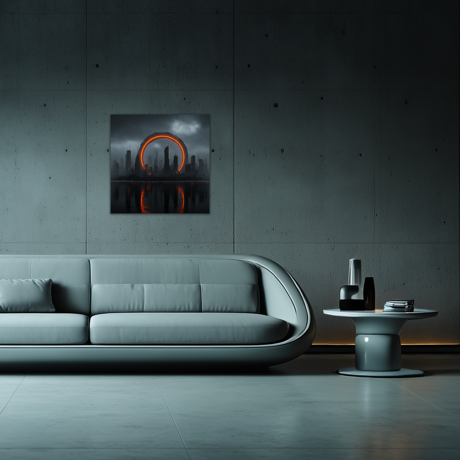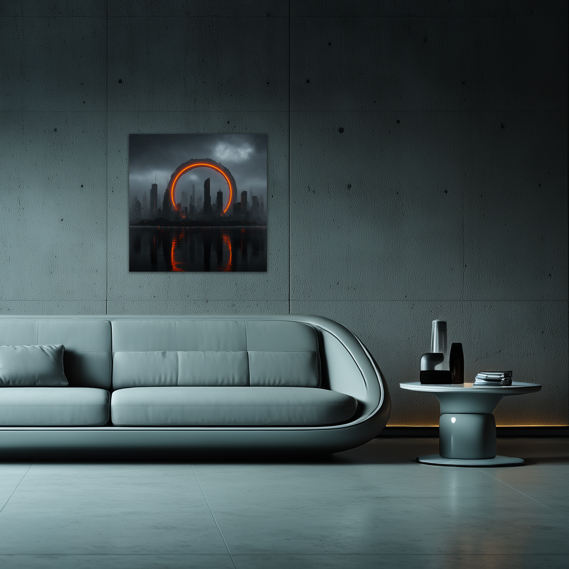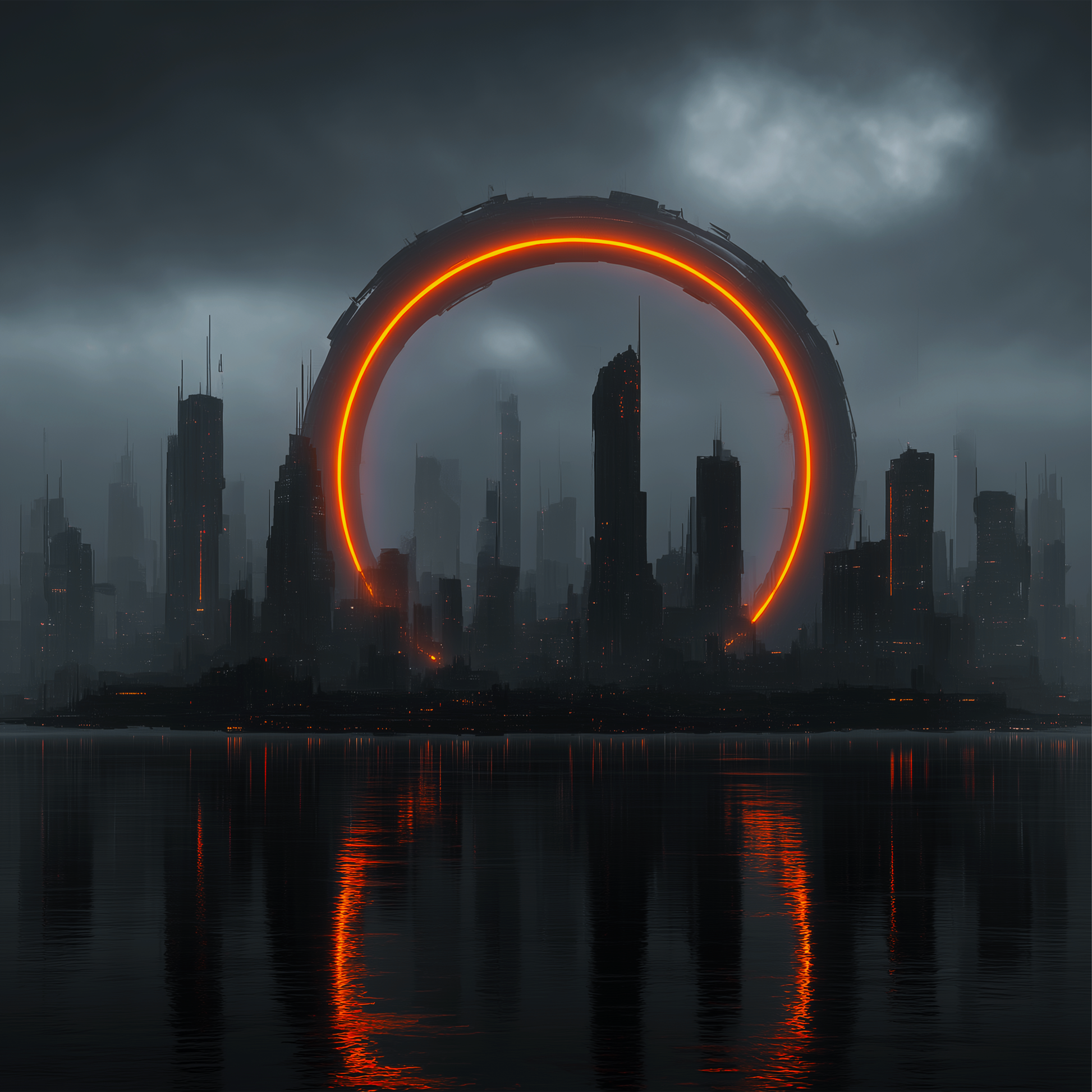 Derrière un voile de brume urbaine, un anneau de feu surgit, irradiant l’obscurité d’une intelligence mécanique.